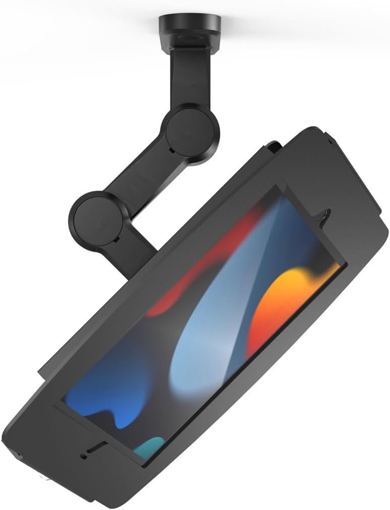 The mount extends up to 9.97 inches from the wall and features two joints, making it perfect for corners, under cabinets, or areas with limited space. The Space iPad Enclosure is crafted with rounded edges and open corners to improve ventilation and provide restricted access to buttons and inputs. This professional-grade mount enables continuous charging of the iPad while enclosed, ensuring seamless use without the need to unplug peripheral cables.